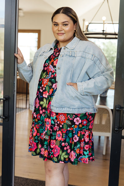 Experience the beauty of summer days wearing the Be Someone Floral Dress! Featuring a self-tie keyhole neckline closure, puff sleeve, tiered skirt, and bright floral print on a black background, this dress has it all - even pockets! Enjoy the sunshine in vibrant style.