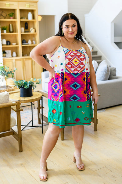 Say hello to summer style in the Camilla Tiered Embroidered Dress! With adjustable straps, true embroidery, and a bright color block design featuring colorful Aztec print, this dress will have you standing out in the sunshine!