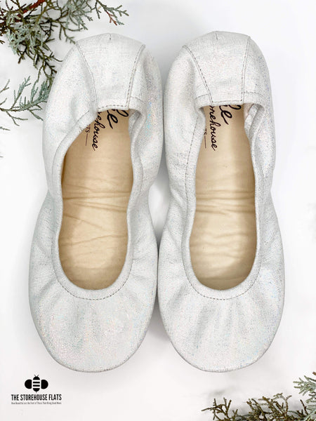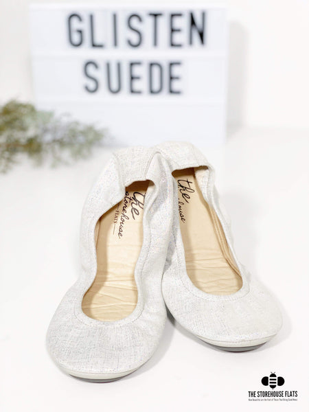 White suede printed with an iridescent rainbow. We are dreaming of the season of frosty windows, and snowflakes glistening in the sun. Feel like peacock and blue jean suede.