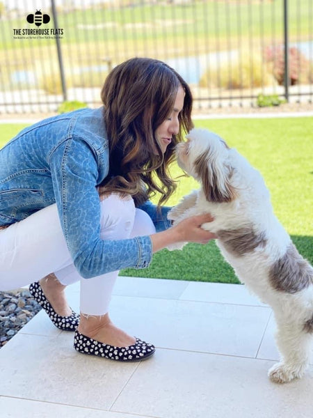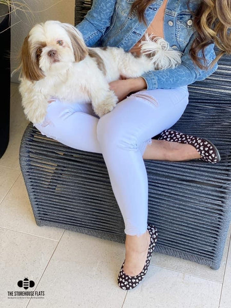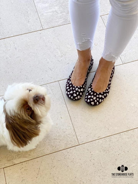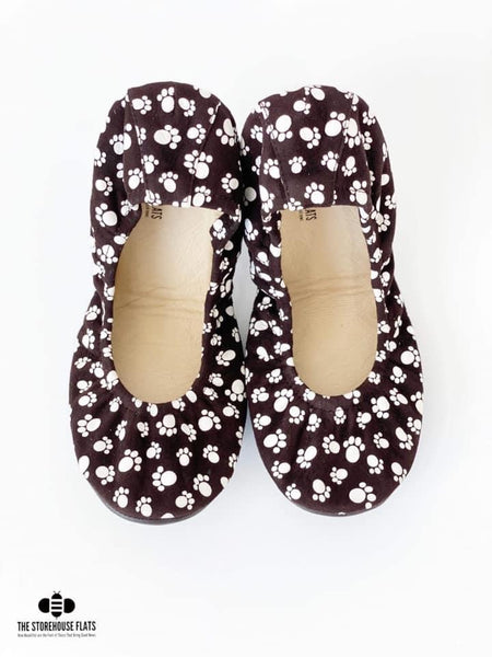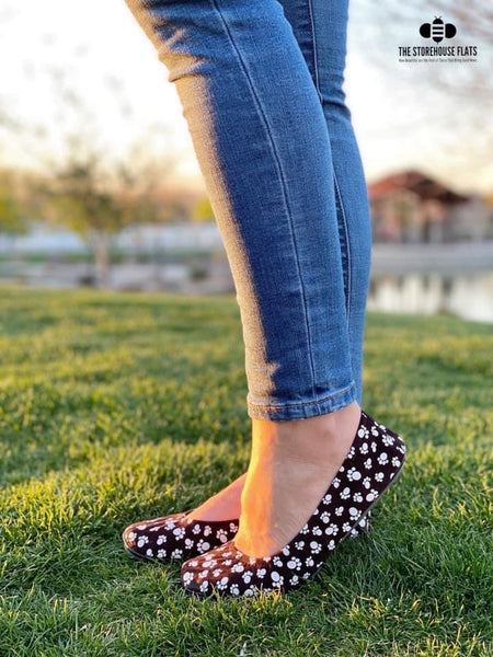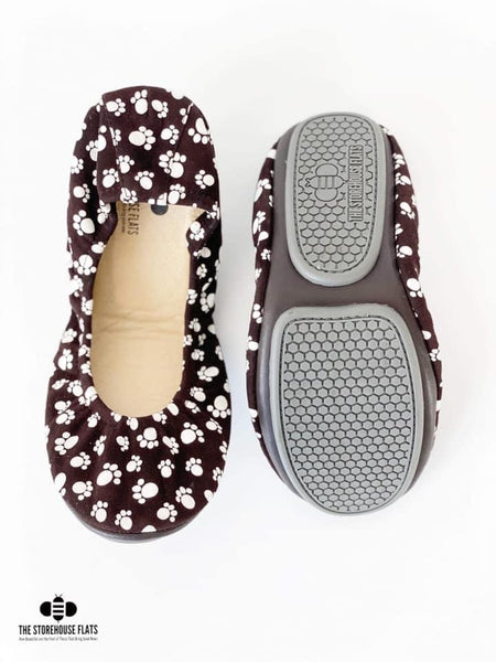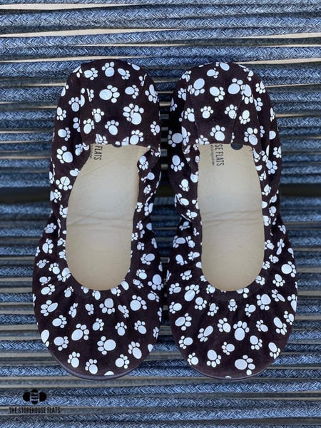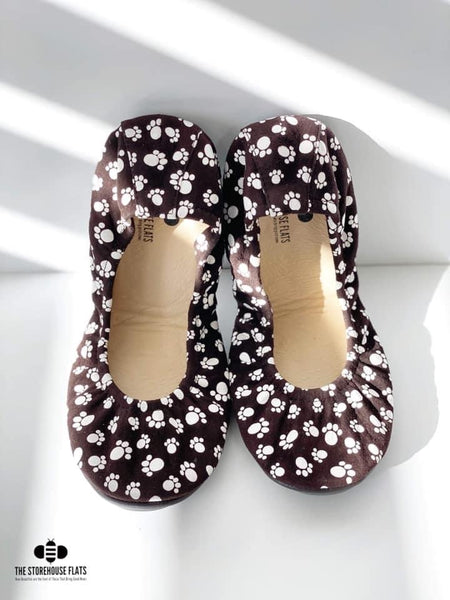 Last year we took a survey and asked you, “What do you want on a shoe?” You asked and we answered! Adorable white paw prints on a dark brown suede flat. Represent the love your have for your furry friend with these beauties on your feet!