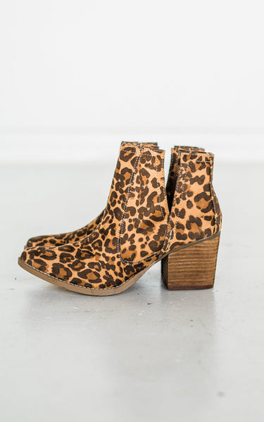 Our Tarim bootie has been a favorite time and time again! We now feature it in leopard pattern upper with a cognac heel.