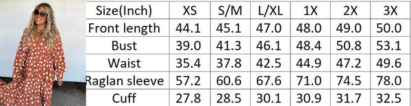 This tiered polka dot midi dress is features a v-neckline, long balloon sleeves with button cuffs, and flowy tiers for movement. Available in navy and rust, both perfect for summer into fall.