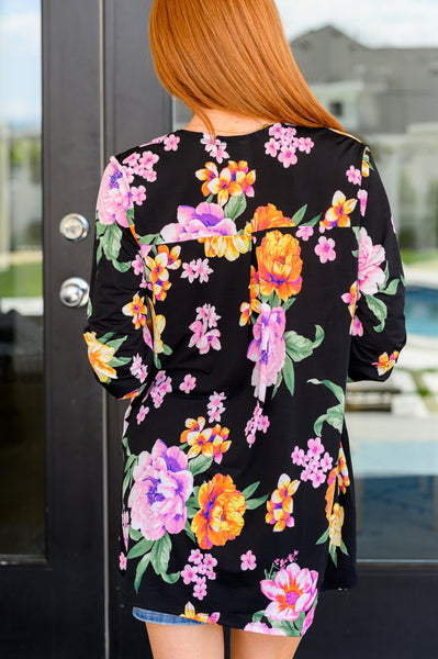 Introducing the Lizzy Cardigan in Black and Lavender Bouquet, the perfect blend of style and comfort. Stay cool with the Bulgari fabric and enjoy wrinkle-resistant and lightweight properties. Featuring faux button tab 3/4 sleeves, an open front, and a pleated back for a unique look. With functional pockets and a comfortable fit, this cardigan is a must-have. Order now for a fresh and playful look (and cozy comfort too)!