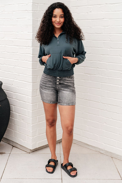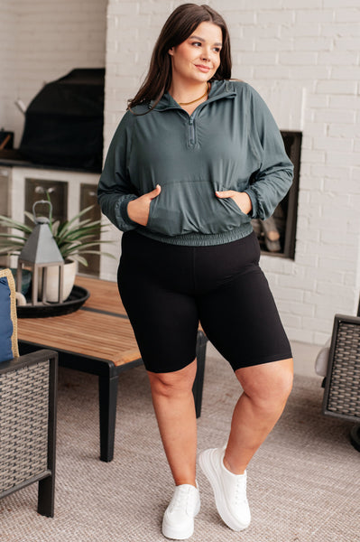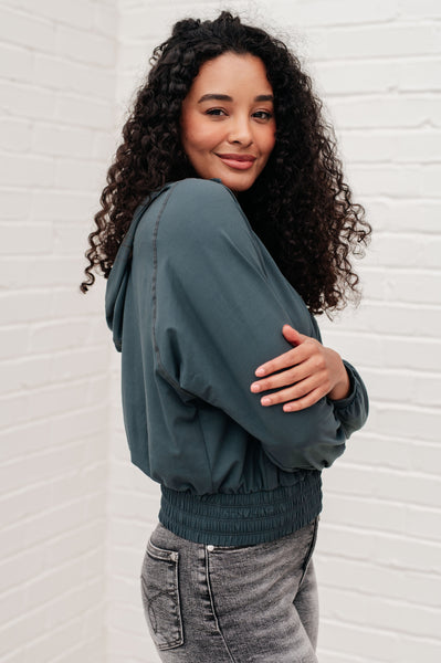 Invest in the perfect "running buddy" with our Morning Run Half Zip Hoodie in Smoked Spruce. Made with brushed microfiber for a soft touch, this hoodie also features a half zip for ventilation and a smocked elastic waistline for a flattering fit. Complete with a hood and kangaroo pocket for added convenience, this hoodie is the perfect addition to your closet!