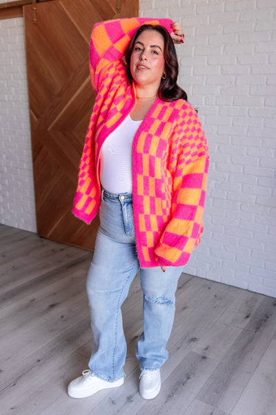 Stay warm and stylish in the Noticed in Neon Checkered Cardigan in Pink and Orange! This loud yet cozy cardigan features a sweater knit, and an open front design for a classic-yet-chic look. The vivid neon-checker pattern in pink and orange makes a bold statement, while side seam pockets keep hands warm. Oversized fit provides a comfortable look for chilly days.