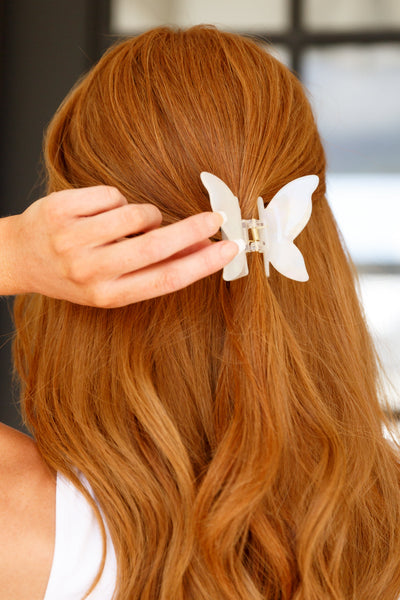 Make a statement with the beautiful Pearl Butterfly Claw Clip! Its iridescent pearl design, butterfly wings, interlocking claws, and metal hinges provide durable hold and style to make sure your hair looks perfect all day long.