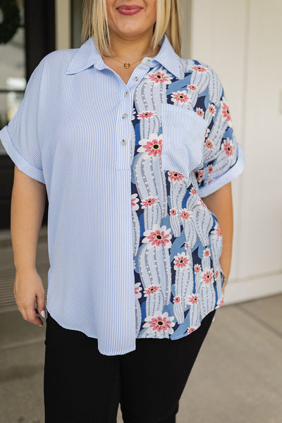 Let your style speak for itself in this bold Best Of Both Worlds Button Down Top. Perfect for any occasion, it features a mixed print with a bold floral on one side and a classic stripe on the other, patch pocket and cuffed dolman sleeves for a fun and effortless look. Go ahead and express yourself!