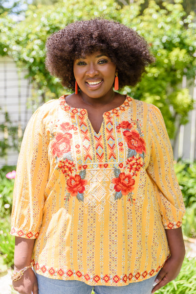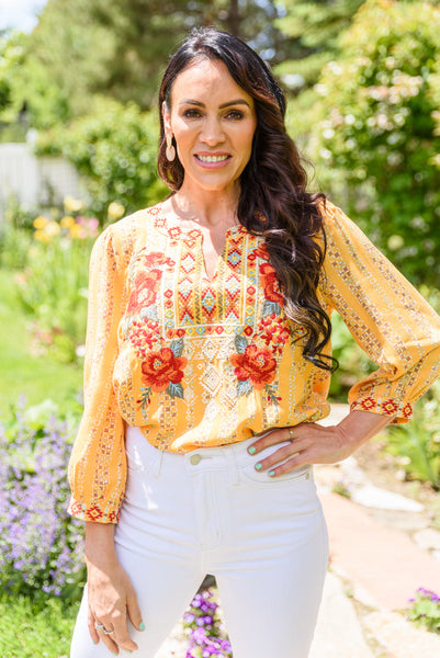 A shirt just as pretty as you! The freehand Art Shirt has details we will be infatuated with for days! Featuring a notched neckline decorated in floral embroidery that flows into an a-line silhouette, subtle balloon sleeves, and beautifully embroidered cuffs.