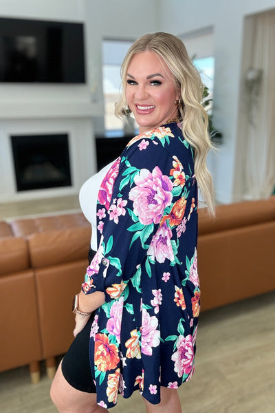 Introducing the Lizzy Cardigan in Navy and Lavender Bouquet, the perfect blend of style and comfort. Stay cool with the Bulagri fabric and enjoy the wrinkle-resistant and lightweight properties. Featuring faux button tabs on 3/4 sleeves, an open front, and a pleated back for a unique look. With functional pockets and a comfortable fit, this cardigan is a must-have. Order now for a fresh and playful look (and cozy comfort)!