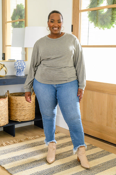 The Long Sleeve Solid Knit Open Back Top In Olive features a lightweight french terry knit that shapes a round neckline, with balloon sleeves and an open back cutout with cross detail. This perfect top creates a simple statement you'll love, becoming your new favorite go to!