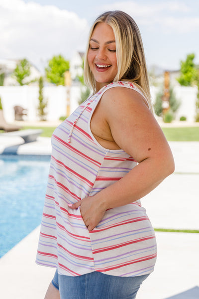 We are so excited to style our new Take A Day Off Hooded Tank! While it has endless styling options, we're pairing it with our bikini and denim cutoffs and heading to the pool! Featuring a notched neckline with faux drawstrings, stretchy soft fabric, and a fun hood in the back! With a sleeveless cut and flowy silhouette this makes for the perfect throw-on piece.