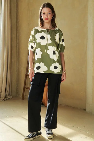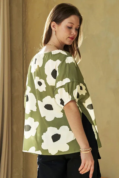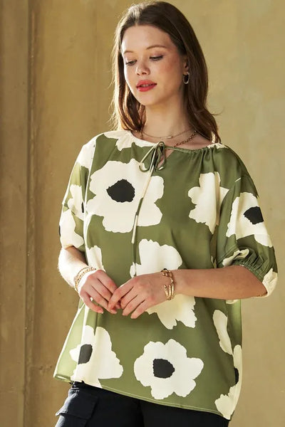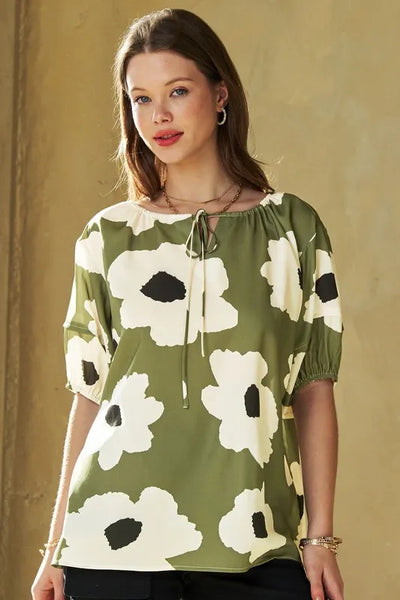 Davi & Dani Floral Tie Front Puff Short Sleeve Blouse