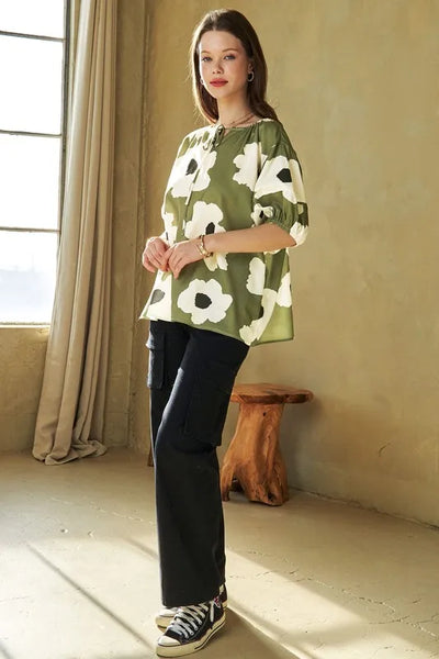 A floral tie-front puff short sleeve blouse top is a charming and feminine piece with delicate floral patterns and trendy design elements. This blouse features a tie-front detail that adds a touch of sweetness and a flattering silhouette. The puff sleeves add a stylish and romantic flair to the top, making it perfect for a chic and effortless look. Pair it with jeans or a skirt for a versatile outfit that exudes summer style.