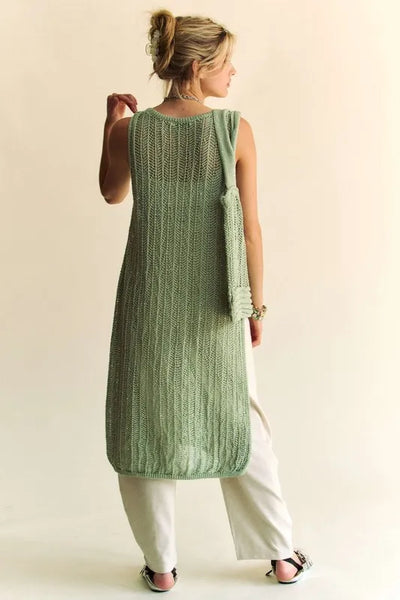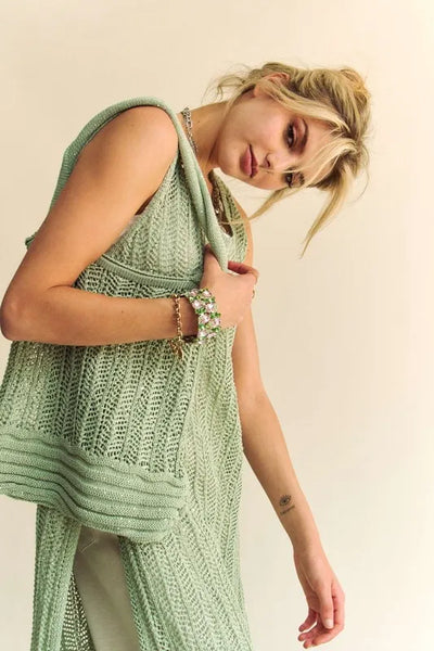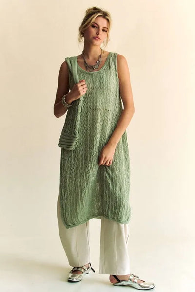The knit side slit round neck sleeveless dress is a stylish and versatile choice for any occasion. Featuring a flattering round neckline and side slits for added movement, this dress is both comfortable and chic. Complete the look with the matching bag for a coordinated and sophisticated outfit. Perfect for a day out or special event, this ensemble offers a fashionable and put-together appearance.