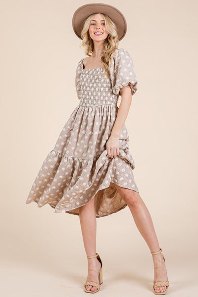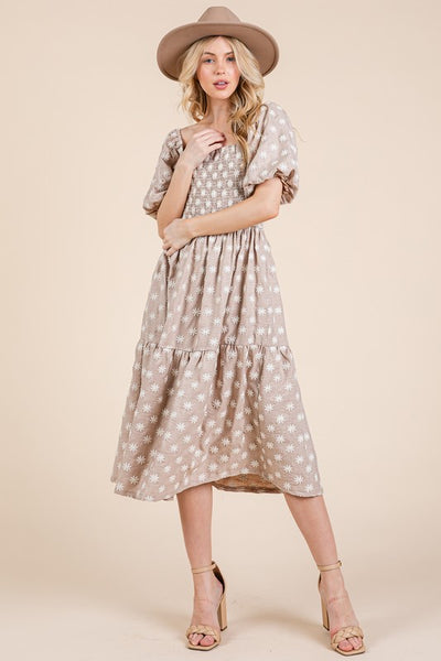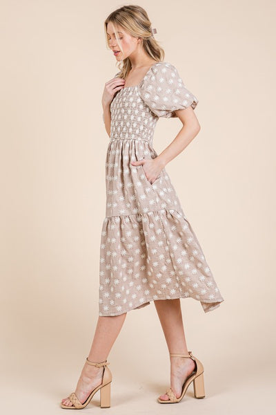 GeeGee Floral Embroidered Smocked Puff Sleeve Tiered Midi Dress