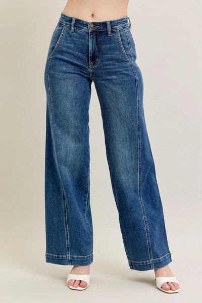These high-waisted wide leg jeans feature premium denim construction with a vintage-inspired medium wash. The elevated waistline creates a flattering silhouette while the relaxed wide leg cut offers contemporary style and all-day comfort. Crafted from quality cotton-blend denim with subtle stretch, these jeans showcase contrast topstitching along the seams and classic 5-pocket detailing. The full-length design with raw hem detail adds modern appeal, making these jeans perfect for both casual everyday wear and elevated street style looks.