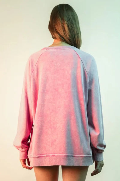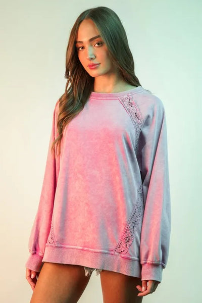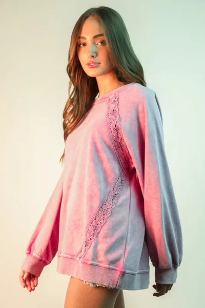 A lace trim detail mineral washed knit top is a lovely and unique piece that combines feminine lace accents with a vintage-inspired mineral washed look. The delicate lace trim adds a touch of elegance and sophistication to the relaxed and comfortable knit fabric. This top can be dressed up with a skirt and heels for a stylish outfit or dressed down with jeans and flats for a casual yet chic look. It is a versatile piece that can easily transition from day to night.