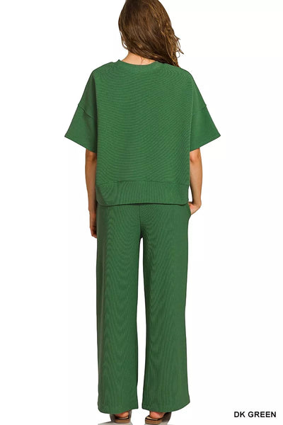 This comfortable and stylish set includes a ribbed round neck tee and matching pants. Perfect for lounging at home or running errands in style. The ribbed texture adds a trendy touch to this classic silhouette. Made from soft and breathable fabric for all-day comfort. Elevate your casual wardrobe with this must-have set.