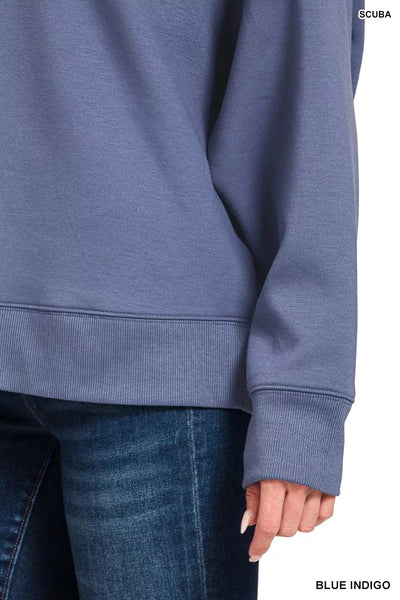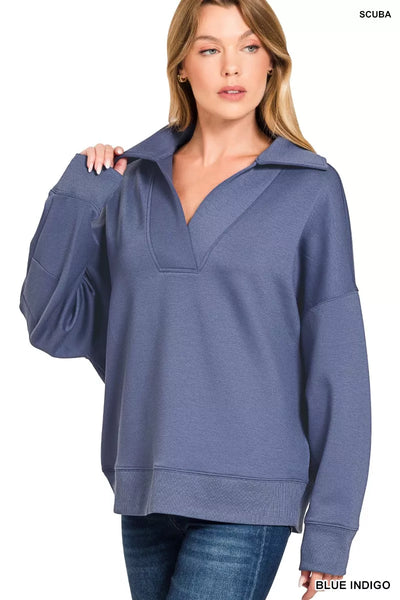 Step up your loungewear game with this sleek scuba collared pullover and pants set. The scuba material offers a modern and stylish look, while the collared design adds a touch of refinement. Perfect for relaxing at home or running errands in comfort and style. Elevate your casual wear with this coordinating set. A must-have addition to your leisure wardrobe.